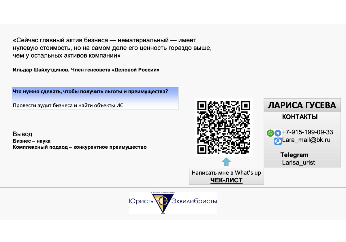 Нематериальные активы в виде объектов интеллектуальной собственности на балансе компании делают ее более привлекательной для инвесторов. Особенно это касается стартапов, IT-проектов, платформенных решений, EdTech проектов, производственных компаний с инновационной составляющей